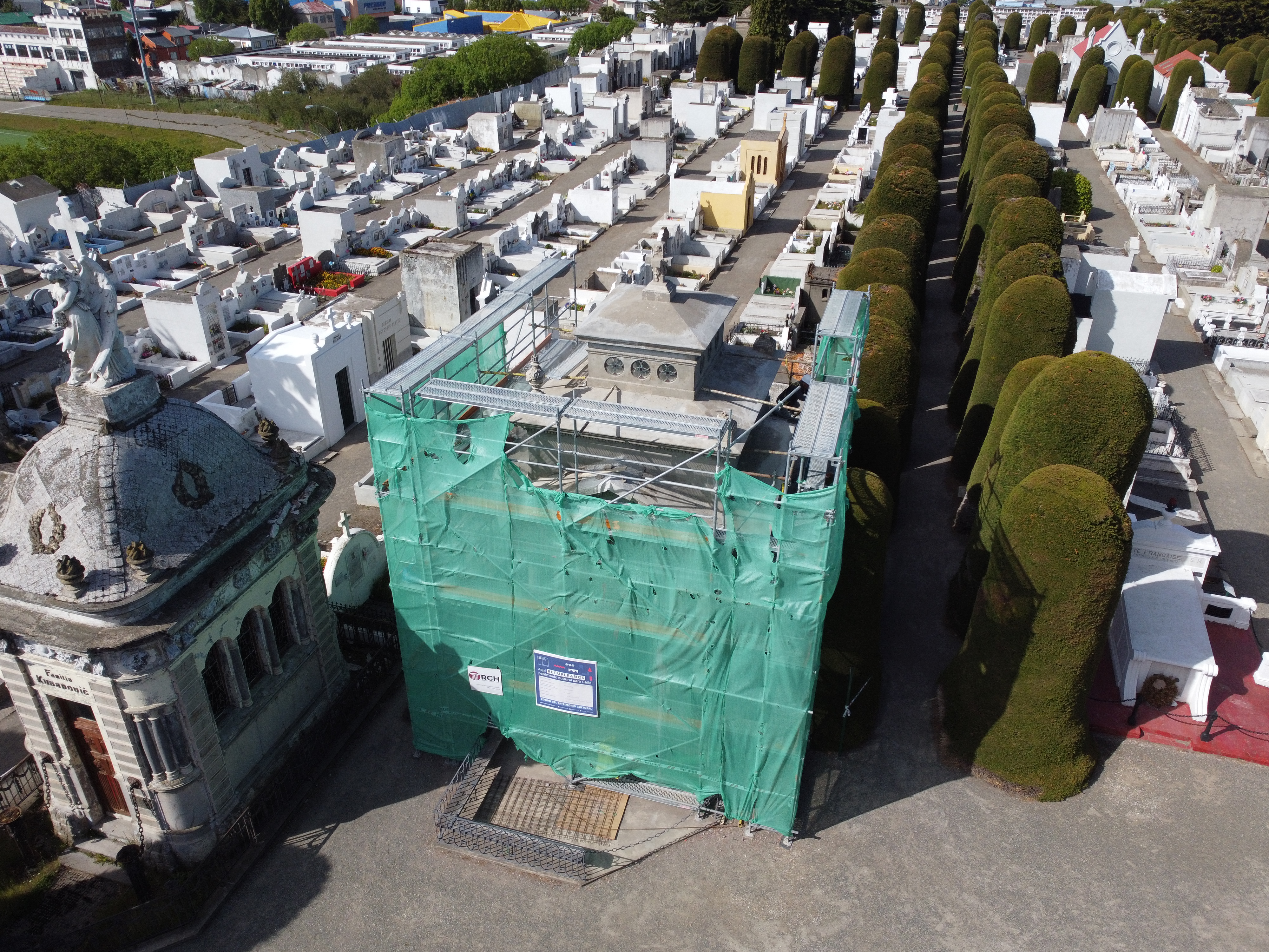 El día 14 de octubre se dio inicio a las acciones de restauración del Mausoleo de la Sociedad Croata de Socorros Mutuos, inmueble que forma parte del Monumento Histórico Cementerio Municipal Sara Braun de Punta Arenas. El proyecto, beneficiado por el Fondo Nacional del Patrimonio Cultural en su convocatoria 2024, modalidad “Intervención en inmuebles con protección oficial, etapa de ejecución”, está centrado en la recuperación de la cubierta y en el saneamiento de los deterioros físico-mecánicos más críticos que afectan la protección del monumento. Por su parte, las obras en el Cementerio Municipal se extenderán hasta principios de febrero de la mano de la empresa especialista RCH Restauraciones Chile, con amplia experiencia en restauración patrimonial y una profesional regional entre sus filas, Así, junto con las acciones específicas que profesionales calificados llevan a cabo, los meses de verano estarán dedicados al saneamiento y consolidación de la cubierta del Mausoleo, orientados principalmente a erradicar filtraciones y estabilizar elementos ornamentales afectados. Con los fondos adjudicados ($84.532.866), la intervención se concentra en las patologías más severas que comprometen directamente la estabilidad y conservación del conjunto. Las obras actualmente en ejecución, permitirán detener procesos de deterioro activo, mejorar el comportamiento frente a la humedad y asegurar condiciones básicas de resguardo tanto para la edificación como para su entorno inmediato.