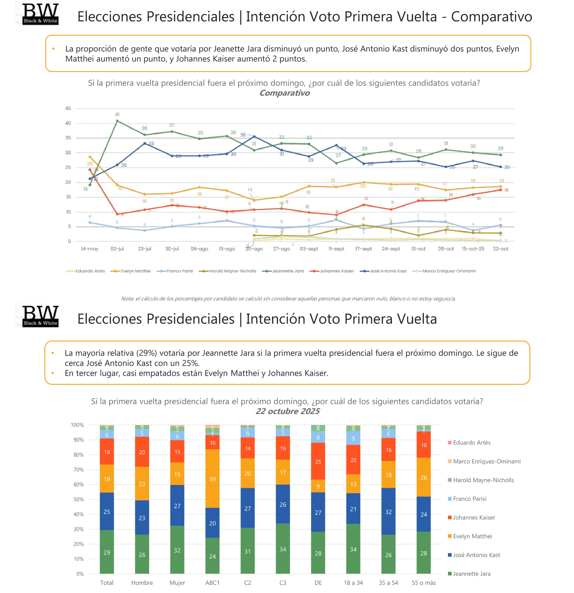 La elección presidencial entró en terreno abierto y con crecientes tensiones en la derecha. La nueva encuesta Black & White muestra que Jeanette Jara lidera la primera vuelta con un 29%, seguida por José Antonio Kast con 25%, mientras la verdadera sorpresa está en el tercer lugar: Evelyn Matthei (19%) y Johannes Kaiser (18%) se encuentran en empate técnico, la brecha más estrecha registrada hasta ahora entre ambos.